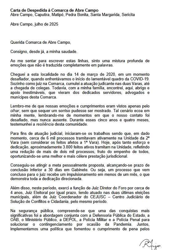Carta de Despedida” do Excelentíssimo Juiz de Direito da Comarca de Abre Campo, Dr. Rodrigo